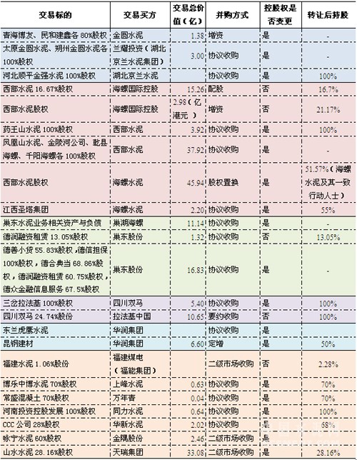 从涉及企业来看,从前的并购大户中国交通近两年放缓兼并重组步伐,今年以来据其公开报告中显示水泥板块只收获了四川女娲建材、牡丹江市江达城建商砼和鸡西市城海水泥(中报显示后两者为2015年1月1日收购,但从2014年数据来看,显然这两个企业在2014年已经计入北方水泥产能,只是财务数据列入到2015年),2014年公司用于水泥、混凝土板块资产收购的治本支出只有2013年的不到十分之一,2015年上半年公司并购的净资产比去年同期减少;海螺水泥不紧不慢地执行着年度并购计划,收购江西圣塔完成了海螺水泥年度并购目标的一半,此后11亿“被动”接盘巢东股份水泥资产板上钉钉,500万吨水泥产能将在被收入囊中,同时海螺水泥入股、增持西部水泥,随后将海螺水泥位于陕西的四家子公司注入西部水泥换股,交易完成后海螺水泥或海螺国际将成为西部水泥的控股股东(占西部水泥扩大后已发行股份约51.57%)。其他企业除轰动全行业的山水水泥股权变化事件之外,金圆水泥资产结构调整、湖北京兰水泥抢滩京津冀、同力水泥业务结构调整等事件都成为水泥行业多事之秋的重大变革。