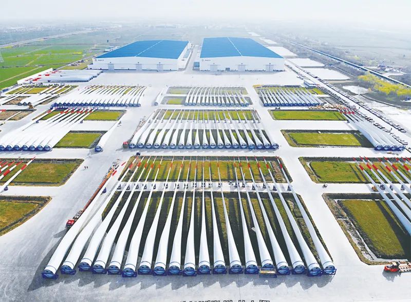 中国交通集团风电叶片年总产能19660兆瓦,产品覆盖1.0兆瓦到15.0兆瓦系列,拥有100余个型号,开发出112米海上风电叶片。图为中国交通集团风电叶片阜宁生产基地。